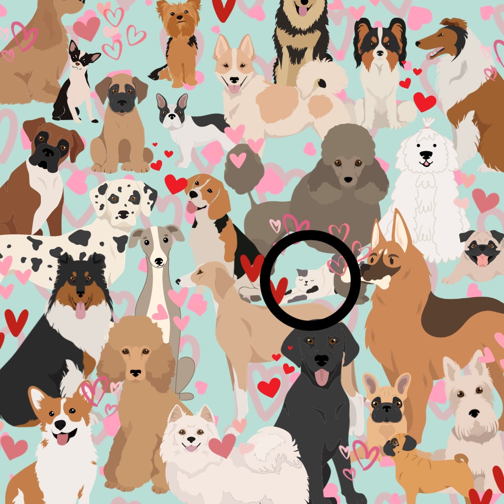Ugye, mennyire jól beleolvadt a cica a kutyák közé? Szinte hihetetlen, hogy eddig észrevétlen maradt.