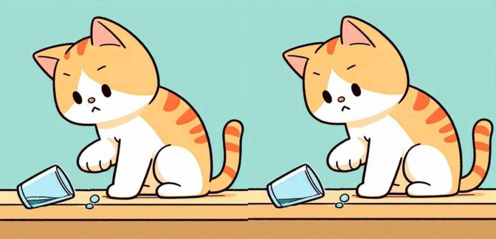 A mai kihívásban egy pohár vízzel játszó cica a főszereplő – pontosabban két szinte egyforma cica. De ha jól megnézed őket, észre fogod venni, hogy valami nem stimmel… Vajon elég gyors vagy ahhoz, hogy 12 másodperc alatt kiszúrd mindhárom eltérést?