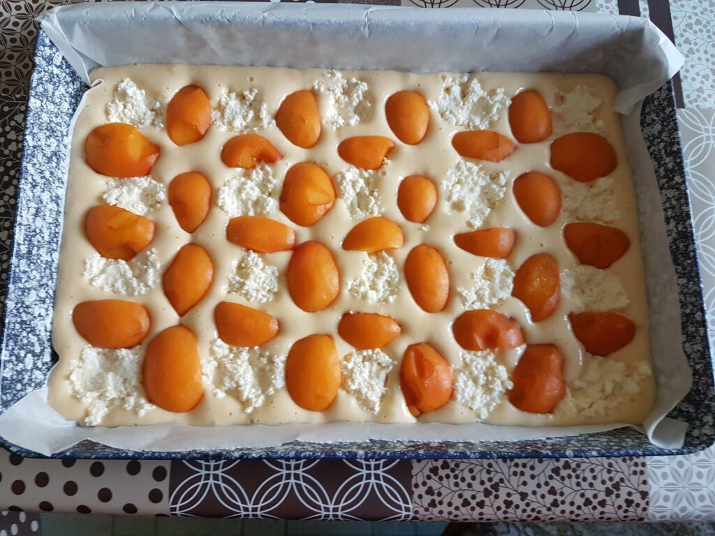 - Az őszibarackokat felszeleteljük, és azt is a túrós piskóta tetejére szép egyenletesen elhelyezzük.