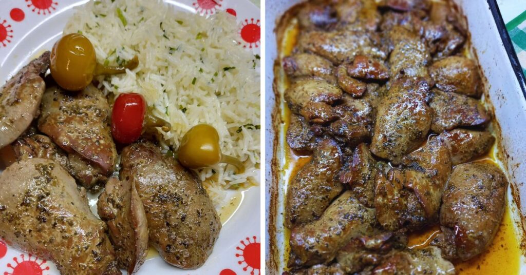 Egy tepsit vékonyan kikenek zsiradékkal, belefektetem a befűszerezett májdarabokat, majd szorosan lefedem alufóliával. Ez nagyon fontos, mert így a máj a saját gőzében sül, és nem szárad ki.
