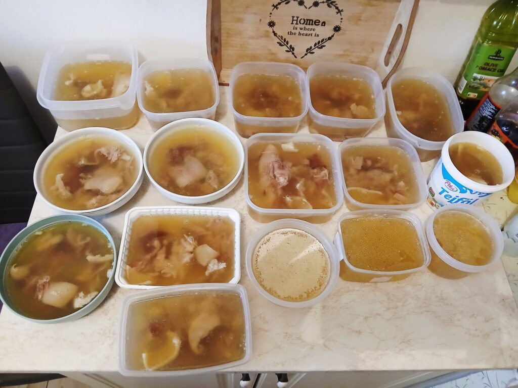 A tányérokat hűtőbe teszem – nem fagyasztóba! – és hagyom néhány órát, hogy a kocsonya természetes módon megdermedjen. Nem kell külön zselésítő anyag: a lassú főzésből kifőtt kollagén teszi a dolgát. 2–3 óra alatt szépen rezgős, áttetsző kocsonya lesz belőle.