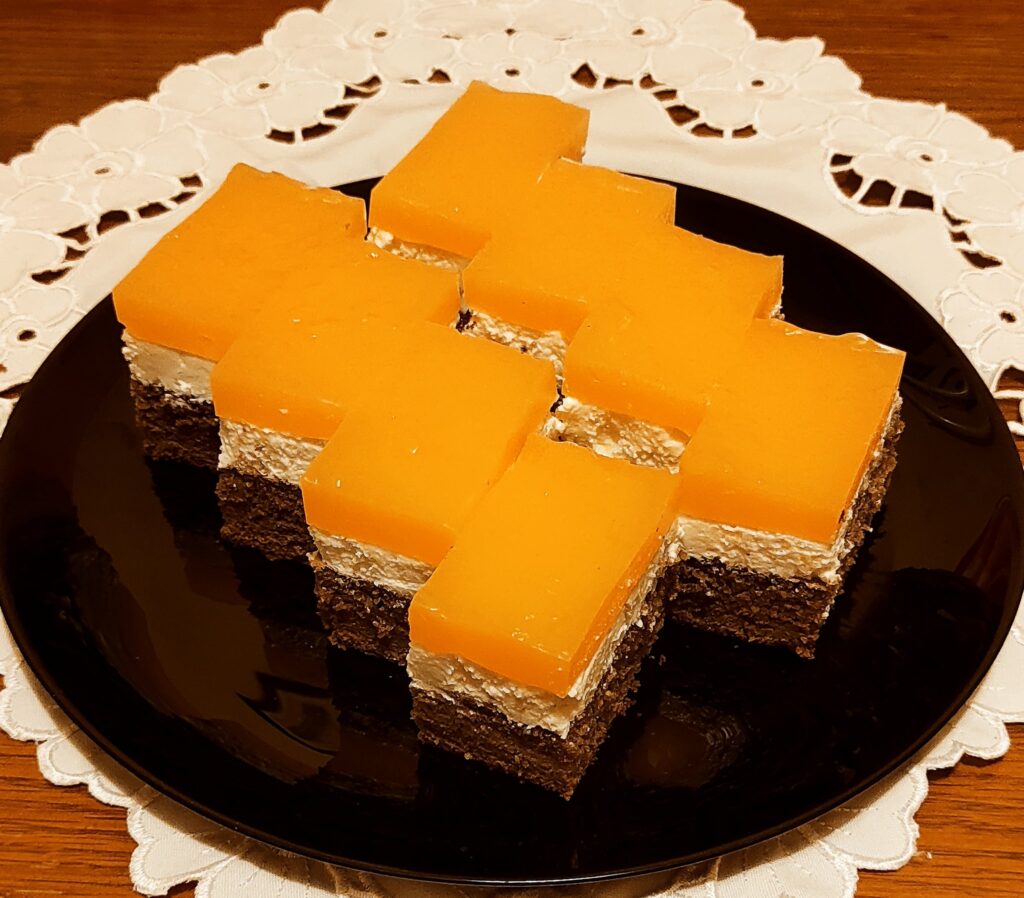 A tejfölös krém könnyű és friss ízt ad, a narancsos pudingréteg pedig látványos, élénk színt visz a tetejére. Az eredmény egyszerre krémes és enyhén savanykás, ami jól ellensúlyozza a keksz édességét.