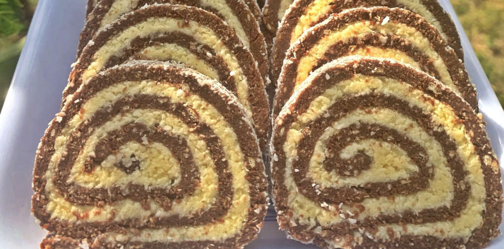 A kókuszos krémet egyenletesen eloszlatjuk a felületen, majd óvatosan feltekerjük, mintha piskótatekercset készítenénk. A rudat kettévágjuk, és legalább két órára hűtőbe tesszük. A pihentetés segít abban, hogy szépen szeletelhető legyen.