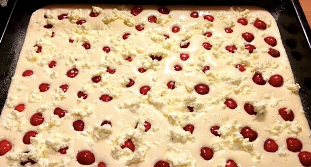 A sütőpapírral bélelt tepsibe simított tésztára jöhet a magozott meggy vagy cseresznye. A gyümölcs enyhén belesüpped a tésztába, és sütés közben kellemesen savanykás ellenpontot ad az édességnek. A túrót egy tojással keverjük el, szükség szerint porcukorral édesítjük, majd kisebb halmokban elosztjuk a gyümölcsök között.