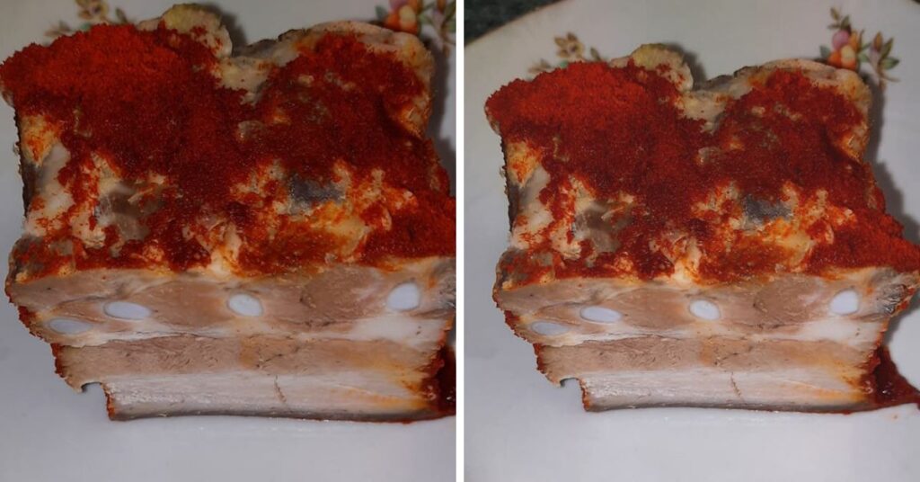 Ezután bőven megszórom jó minőségű őrölt pirospaprikával, majd félreteszem hűlni. Ahogy kihűl, szépen megdermed.