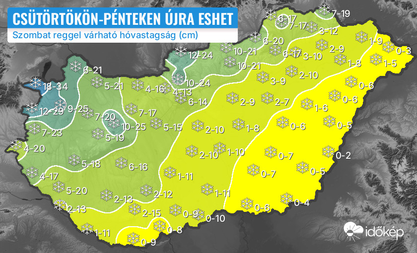 Csütörtökön a ciklon melegszektora éri el hazánkat, így eleinte főként az északi tájakon várható havazás, délen inkább eső valószínű. A hidegebb levegő péntek hajnalban kezd beáramlani. Ettől kezdve egyre nagyobb területen alakulhat át a csapadék havazássá. A hétvégére így többfelé is fehéredhet a táj, de a pontos mennyiségek még kérdésesek.