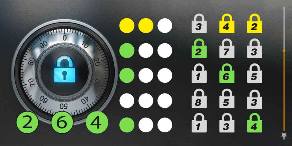 Nézd meg jó alaposan a képen lévő három szám együttesét, és a mellettük lévő színes pöttyöket. A fehér pöttyök mutatják meg neked, hogy hány szám nincs a kódban abból a sorból, a sárgák azt jelzik, hogy két szám szerepel benne, de a harmadik nem, és a zöld azt jelzi, hogy az egyik szám biztosan jelen van a kódban.