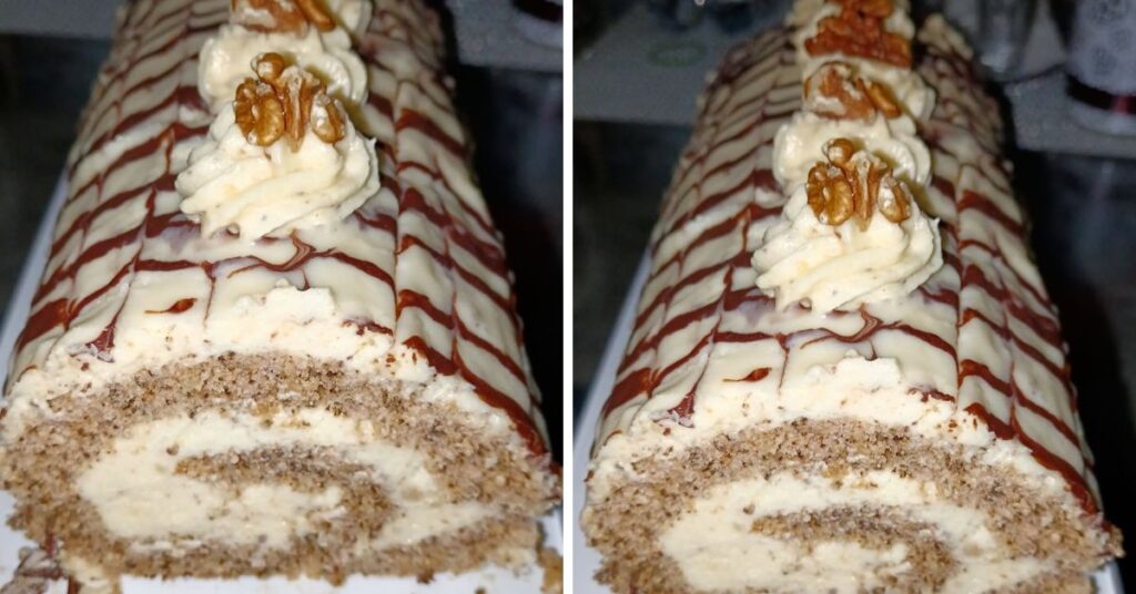 5. Amint kihűlt a piskóta óvatosan kitekerjük, egyenletesen megkenjük a diós krémmel, majd visszatekerjük.