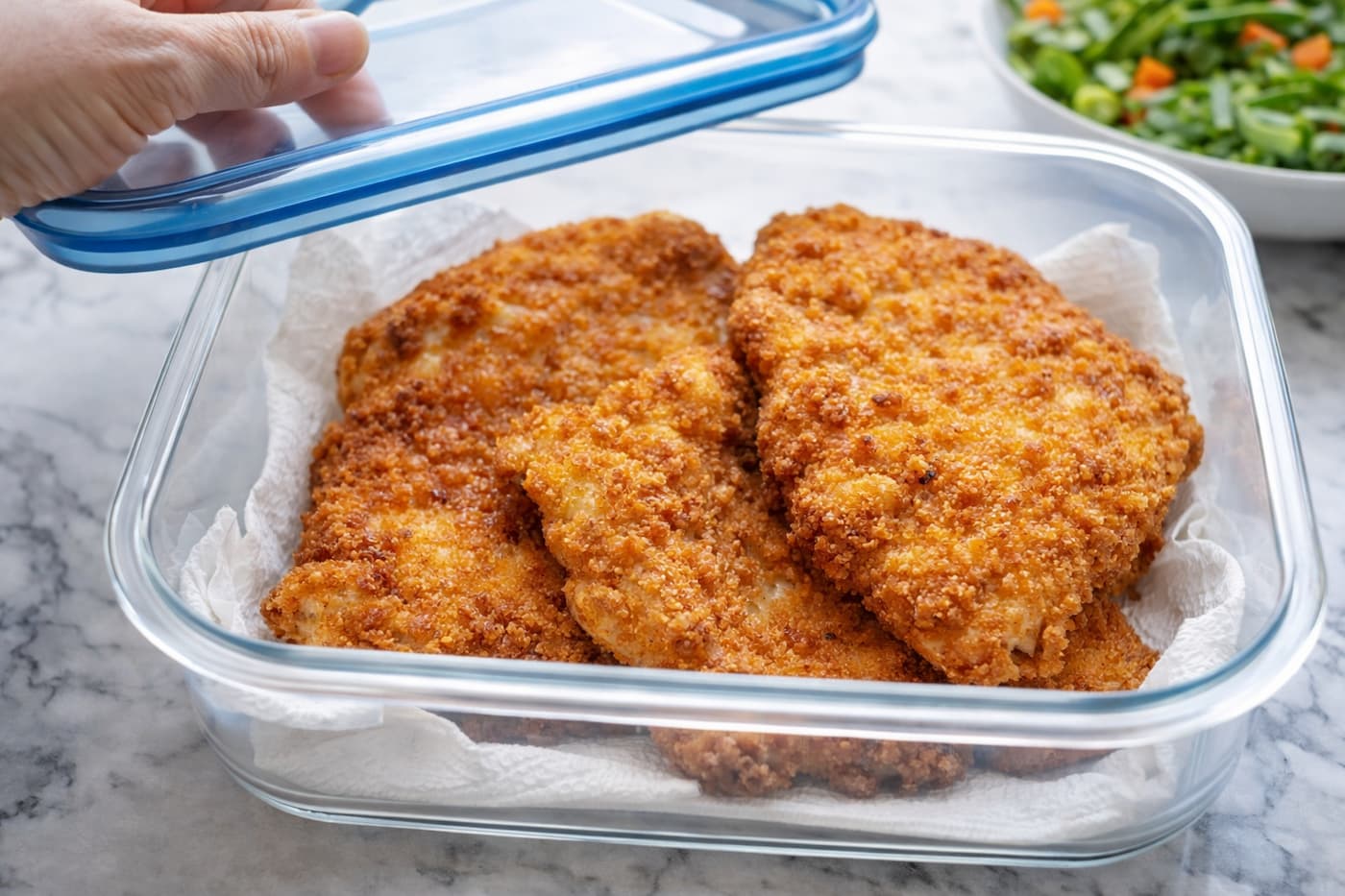 A panír akkor marad ropogós, ha a felületén a pára el tud távozni, és a zsiradék nem áztatja el. Amikor forrón a dobozba tesszük vagy folpackkal lefedjük, a sült hús felületén kondenzálódik a nedvesség, ami idővel puhítja a panírt. Ezt sokan tapasztalták már otthon, például családi ebédek után, amikor a maradékot összedobják egy tálba és a hűtőben hagyják egy éjszakára.