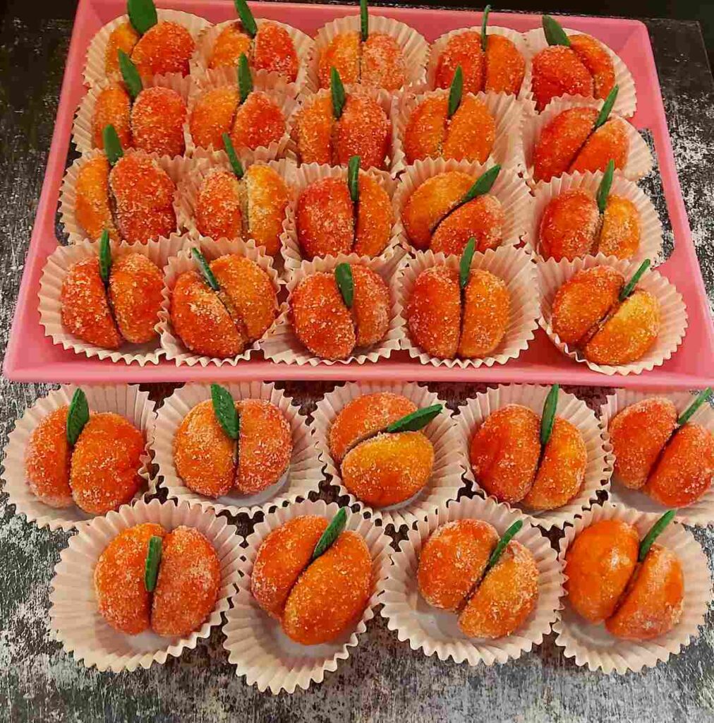 A tojásfehérjéket enyhén felverjük, majd ételfestékkel barackszínűre színezzük. A kész sütiket ezzel vékonyan megkenjük, majd kristálycukorban megforgatjuk, amitől a felületük enyhén csillogó, szemcsés lesz.