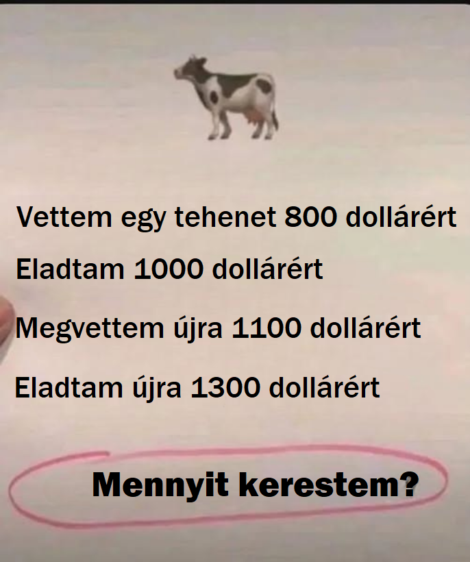 Az első lépésnél 800 dollárt fizetünk a tehénért, majd 1000 dollárért továbbadjuk. Ez eddig teljesen világos, hiszen 200 dollár marad nálunk. A gond ott kezdődik, amikor a történet nem áll meg, hanem visszatérünk ugyanahhoz az állathoz, ezúttal magasabb áron. Sokan itt veszítik el a fonalat, mert a fejünk hajlamos külön kezelni az egyes üzleteket, miközben a pénzünk egyetlen közös egyenlegen mozog.