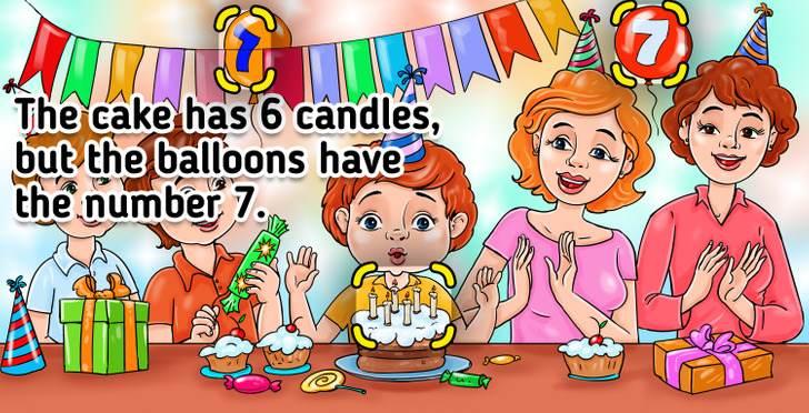 Ha alaposabban megnézzük a tortát és a lufikat, feltűnhet az eltérés. A lufikon a hetes szám látható, ami arra utal, hogy a gyerek a hetedik születésnapját ünnepli. A tortán viszont csak hat gyertya ég.
