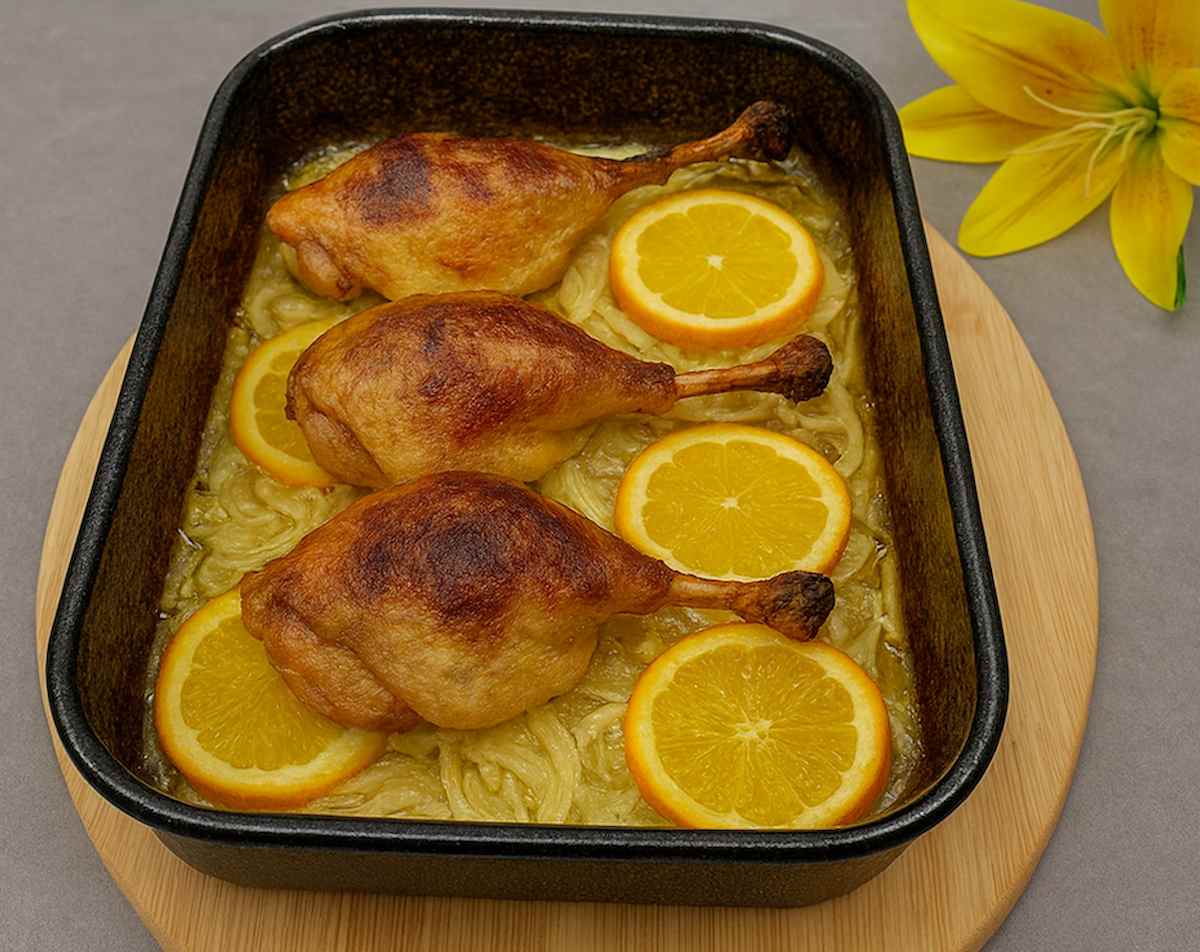 A narancs és a rozmaring párosa különösen jól működik a kacsával. A gyümölcs enyhe édessége és frissessége szépen ellensúlyozza a hús gazdag ízét, a rozmaring pedig aromát ad az egész ételnek. A köretként kínált hagymás törtburgonya pedig egyszerű, mégis olyan kísérő, amely jól illik ehhez a karakteres sült fogáshoz.